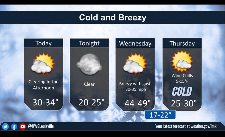 According to Louisville National Weather Service, skies will clear but it will remain chilly. Thursday morning, temperatures will dip into the single digits.