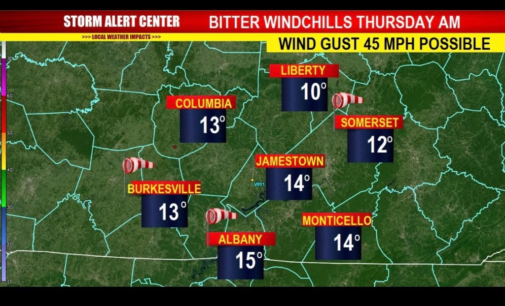 Winter continues. Our next concern will be THURSDAY MORNING where we will likely see wind gust to 45 MPH and temperatures across southern Kentucky in the low to mid teens. Across east and north east Kentucky, expect single digit wind chill readings.